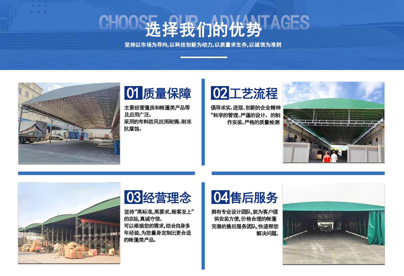 遼寧拓圖鋼結(jié)構(gòu)工程有限公司是一家專業(yè)從事推拉篷設(shè)計(jì)、制作、安裝、使用、維修的綜合性公司。公司主營(yíng):電動(dòng)雨棚、活動(dòng)雨棚、倉(cāng)庫(kù)雨棚、體育類雨棚、篷房、篷布、帳篷等系列產(chǎn)品的制作與安裝。    遼寧拓圖鋼結(jié)構(gòu)工程有限公司堅(jiān)持以市場(chǎng)為導(dǎo)向,以科技創(chuàng)新為動(dòng)力,以質(zhì)量求生存,以誠(chéng)信為準(zhǔn)則,倡導(dǎo)求實(shí)、進(jìn)取、創(chuàng)新的企業(yè)精神。“科學(xué)的管理、嚴(yán)謹(jǐn)?shù)脑O(shè)計(jì)、 的制作安裝、嚴(yán)格的質(zhì)量檢測(cè)、良好的后期服務(wù)成就企業(yè)的信譽(yù),為您提供優(yōu)質(zhì)服務(wù)。    遼寧拓圖鋼結(jié)構(gòu)工程有限公司傾力于開(kāi)發(fā)應(yīng)用三維空間結(jié)構(gòu)與新材料的結(jié)合,將廣告藝術(shù)視覺(jué)表現(xiàn)形式與張力膜材科學(xué)的結(jié)合,推出多彩推拉蓬,依靠先進(jìn)的科學(xué)技術(shù),將推拉蓬建筑表現(xiàn)形式無(wú)限延伸,立志走在建筑科學(xué)的前沿,引導(dǎo)建筑時(shí)尚潮流,我們的目標(biāo)是使推拉蓬建筑在中國(guó)發(fā)展壯大。    遼寧拓圖鋼結(jié)構(gòu)工程有限公司憑著極強(qiáng)的事業(yè)熱情和豐富的專業(yè)經(jīng)驗(yàn)以“勤勉進(jìn)取、銳意創(chuàng)新、至誠(chéng)至信”的精神使公司得到迅速健康發(fā)展,業(yè)務(wù)范圍遍及全國(guó)。科學(xué)的管理、嚴(yán)謹(jǐn)?shù)脑O(shè)計(jì)、高標(biāo)準(zhǔn)的制作安裝流程,嚴(yán)格把控產(chǎn)品質(zhì)量,熱誠(chéng)的售后服務(wù)是企業(yè)競(jìng)爭(zhēng)力的源泉。    遼寧拓圖鋼結(jié)構(gòu)工程有限公司人愿以最誠(chéng)摯的態(tài)度,歡迎廣大客戶的蒞臨與溝通!愿為市場(chǎng)提供優(yōu)...
